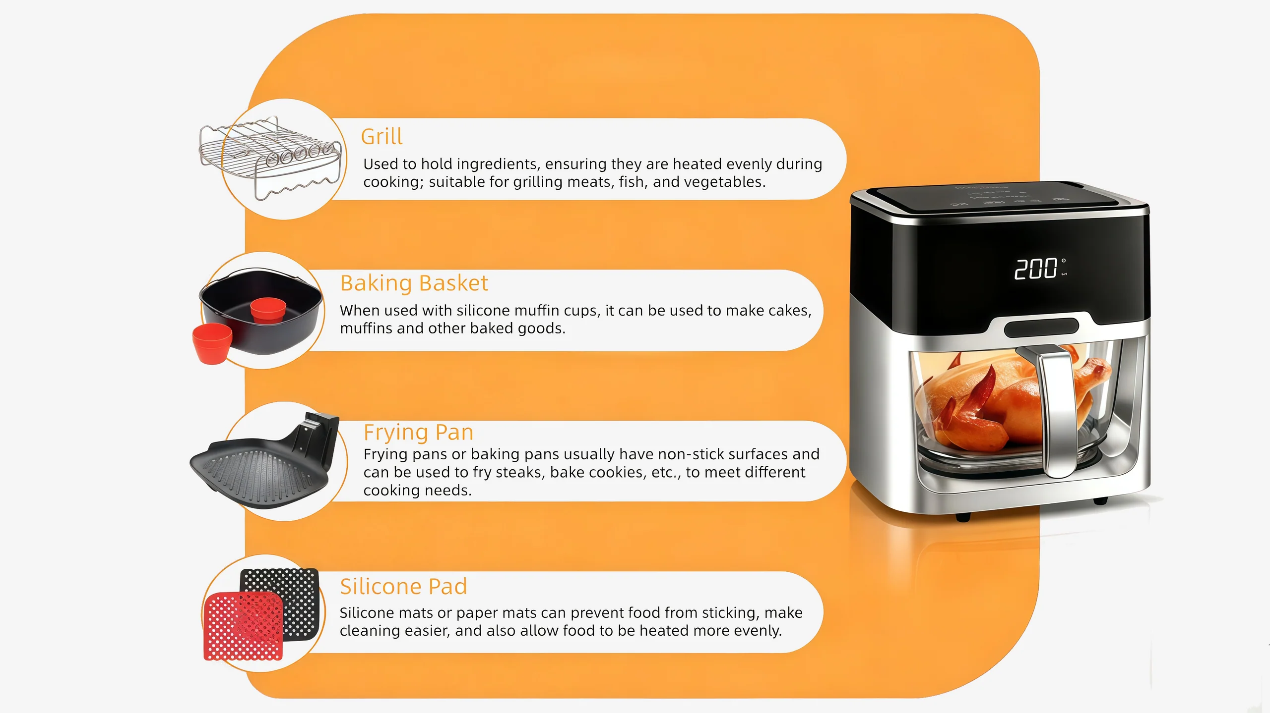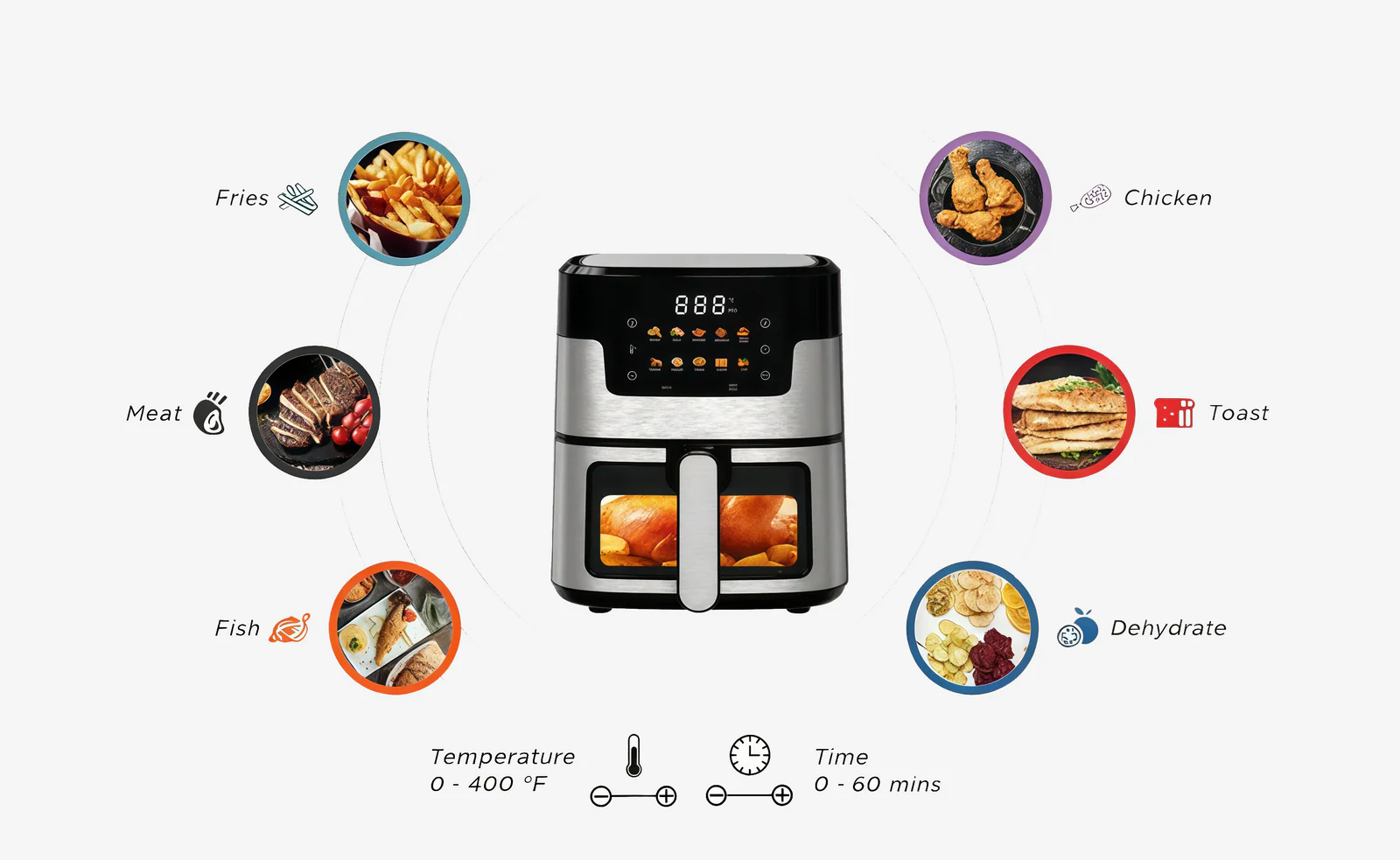 Whether you want to fry, bake, roast, or grill, our air fryer makes it simple to prepare different dishes all in one appliance. It’s designed to help you create tasty meals without the hassle.